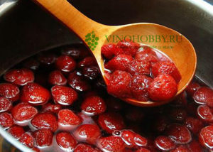 - Воду из-под крана обязательно прокипятить, так как в ней могут быть следы хлора. Один килограмм сахара полностью растворяем в остывшем кипятке. Получившийся сироп остужаем до 25-30 градусов, так как при температуре выше указанной дикие дрожжи, содержащиеся в ягодах, потеряют свои свойства, брожение будет длительным.