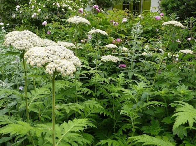 Этот декоративный вид так же достаточно популярен среди садоводов. Это травянистое растение является многолетником. Душистые щитковидные соцветия обладают белым окрасом.