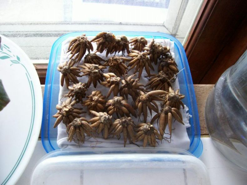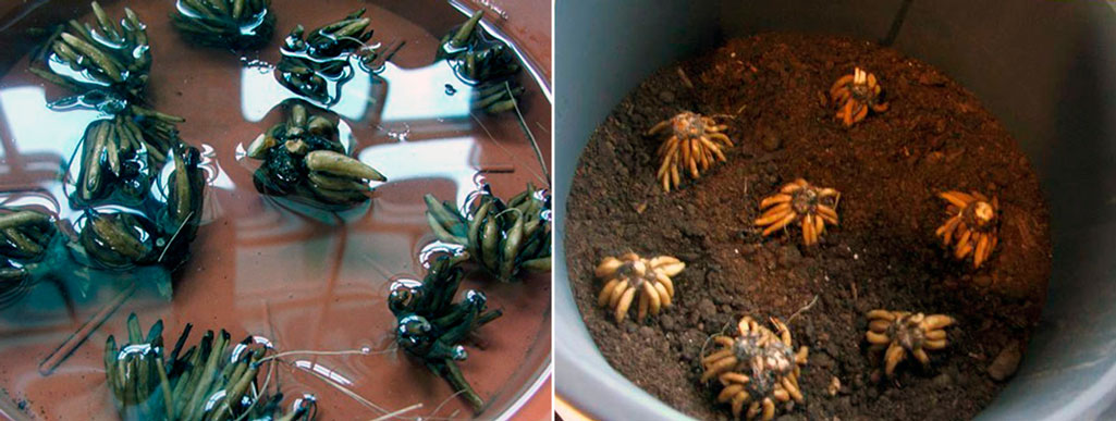 - Залить в глиняной емкости 1, 5 литрами воды 3 клубня растения.