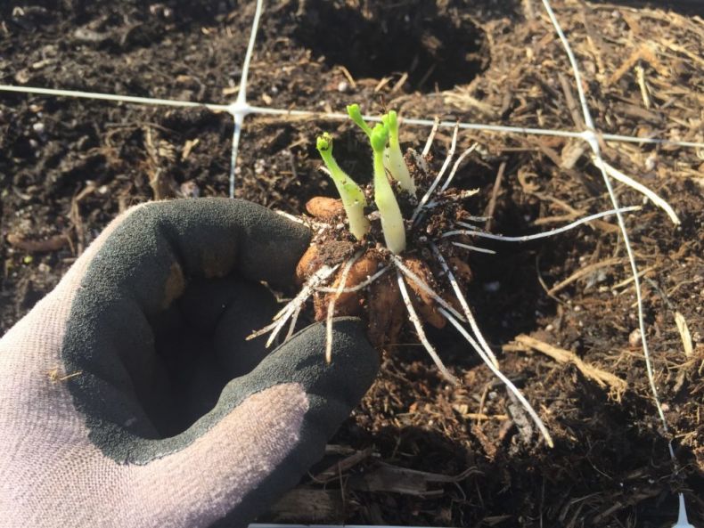 В подготовленную посадочную яму надо опустить клубень обязательно «клювиком» вниз на глубину от 5 до 8 сантиметров. Между растениями необходимо выдерживать расстояние от 10 до 15 сантиметров. В том случае, если ожидаются заморозки, то посадки следует накрыть соломой либо специальным укрывочным материалом. Спустя 2–3 месяца на каждом кустике вырастет несколько цветоносов, а цветение начнется еще спустя какое-то время.