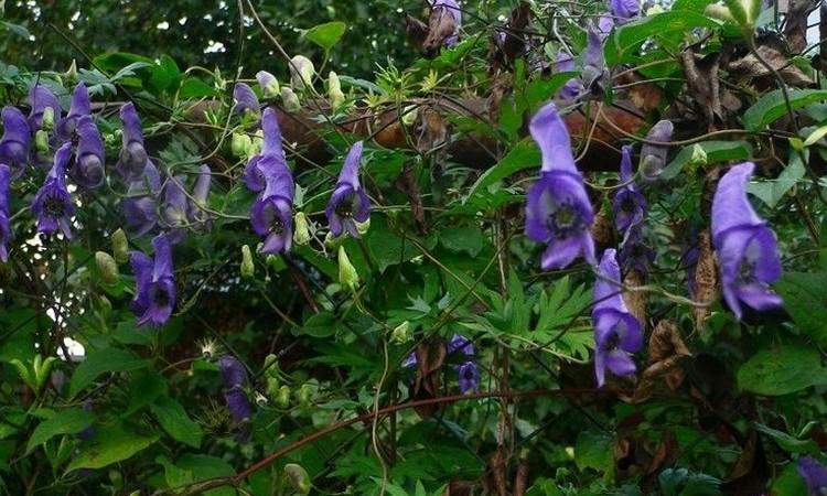 Дуговидный. Благодаря вьющемуся стеблю аконита дуговидного садоводы выстраивают живые изгороди. Растет в тени, не ядовит.