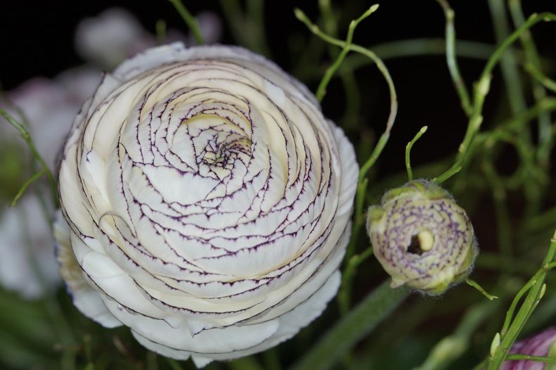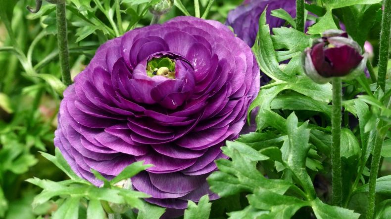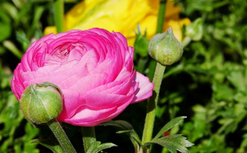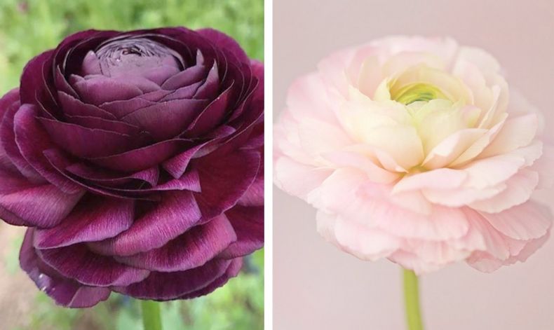 На фото ранункулюса можно увидеть, что нераскрывшиеся цветы строением очень схожи с цветами розы, а после раскрытия с маками. Побеги у растения крепкие и на них располагаются рассеченные листья.
