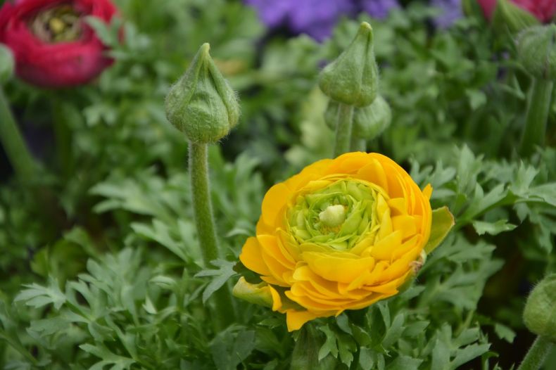 Цветы ранункулюса, диаметр которых может достигать 10 сантиметров, могут обладать разнообразными окрасками, за исключением синей и голубой. Цветение происходит с конца весны по конец лета.