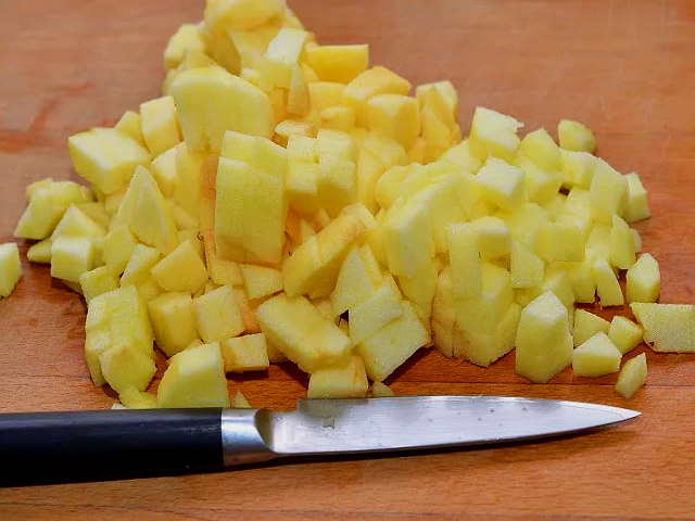 - полученные части тыквы мелок нарезаются кубиками или дольками и отправляются в посуду;