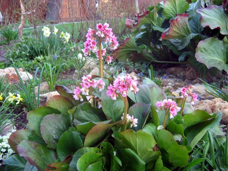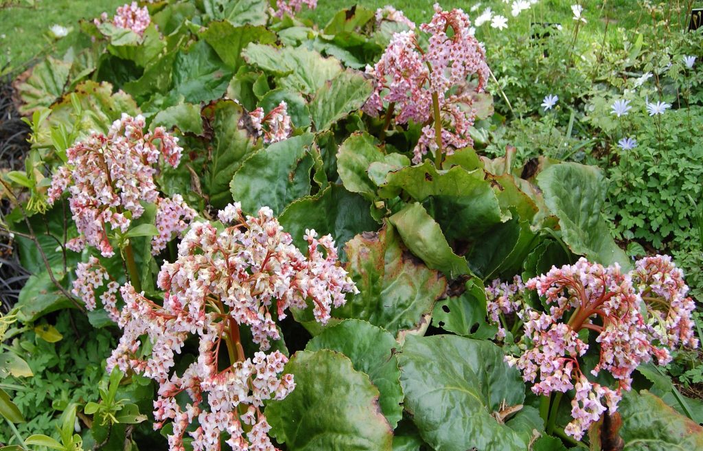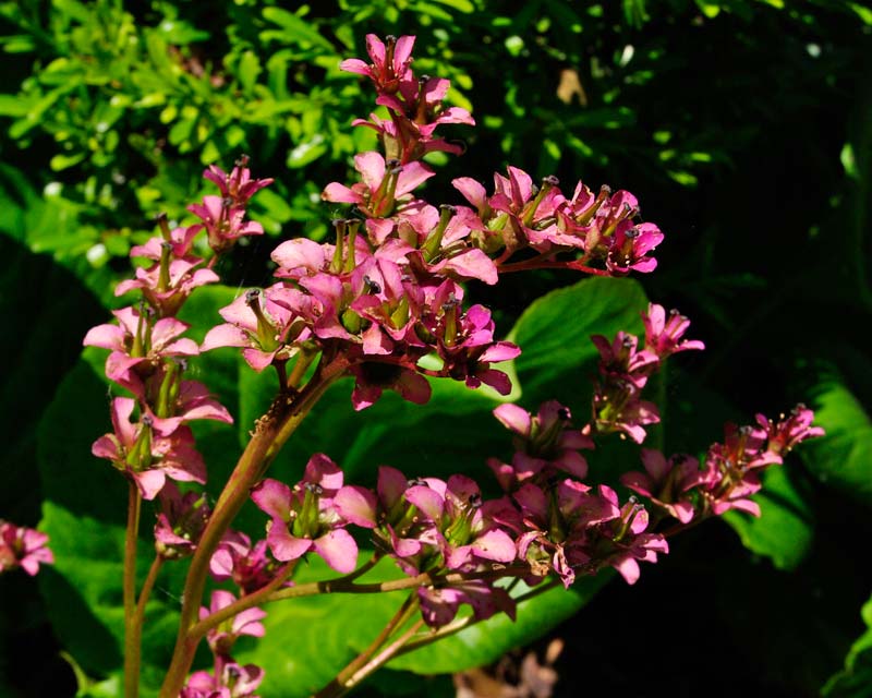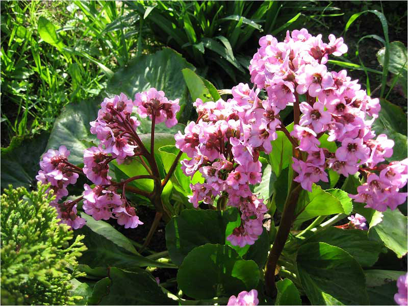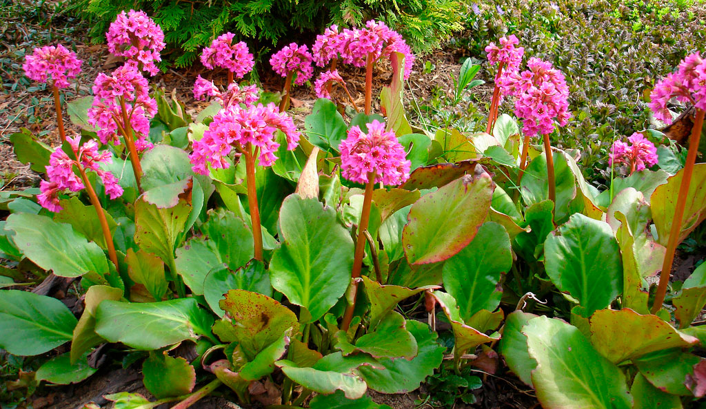 весной кусты бадана украшают многочисленные соцветия с яркими цветками