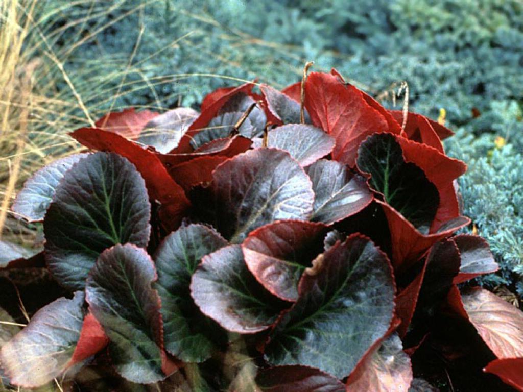 в сентябре листья бадана меняют свою зеленую расцветку на колоритную осеннюю гамму, и растения вновь выходят на первый план, привлекая внимание яркими красками
