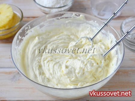 15. Выкладываете часть кокосового крема, разравниваете и раскладываете кусочки ананаса. Еще небольшой слой крема и накрываете вторым пластом.