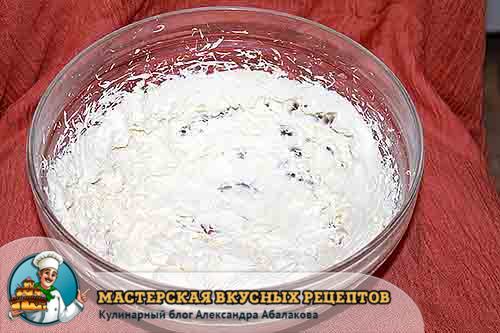 12. Приблизительно третью часть крема откладываете, а в остальную массу подмешиваете кокосовую стружку. Даете готовой кремовой массе постоять в холоде минут 20, чтобы стружка немного разбухла.
