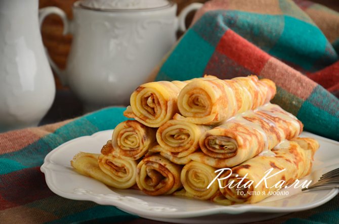 Даем блинам слегка остыть, поливаем сгущенкой и подаем на стол. Приятного аппетита!