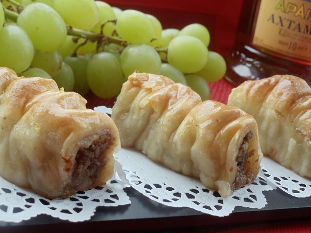 Таким же образом раскатайте, просыпьте начинкой и сверните все оставшееся тесто. Сделанные кусочки пахлавы выкладываем на застеленный пергаментом противень и накрываем сделанные кусочки полотенцем, чтоб не сохли.