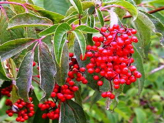 Бузина красная – это многолетнее растение кустарного типа, у которого очень много стеблей, идущих от самых корней. Высота кустарника зависит от места ее посадки и может достигать до 3-5 метров в высоту. На коре растения имеются специфические бугорки белесого оттенка, через которые бузина получает кислород из воздуха. Фото бузины красной можно увидеть на сайте. В природе оба вида кустарника — красную и черную бузину в свободном распространении можно увидеть на лесных лугах и опушках на пустырях, рядом с дорогами. Часто она встречается на пути к кладбищам и свалкам.