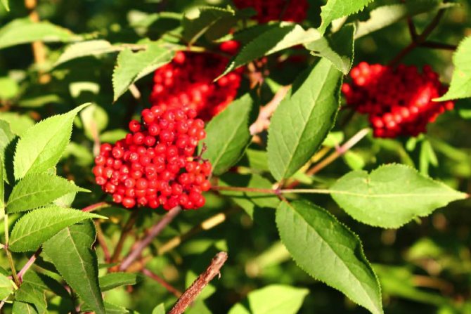 Плоды бузины красной — небольшая, несъедобная ягода с семечками. Время созревания — начало июля. Поспевшие ягоды не употребляют в пищу.