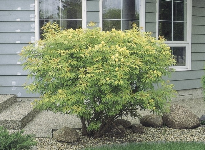 Одна из форм канадской бузины. Отличается зелено-золотистым цветом листвы. Помимо полезных сочных ягод, созревающих в сентябре, весь сезон украшает собой сад. Поскольку кустарник хорошо относится к обрезке, то ему можно придавать различные формы. Сильно разросшийся куст представляет собой шатер. Устойчив к болезням.