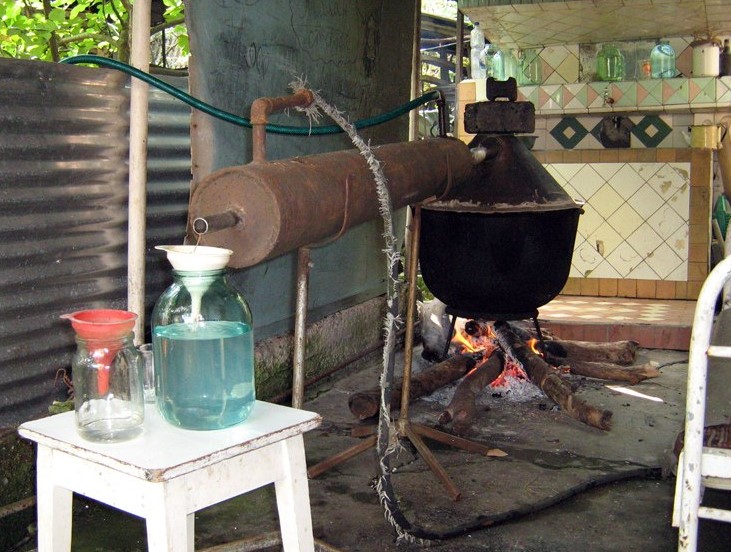 При приготовлении применяются медные емкости. Посуду из других материалов использовать не рекомендуется. В медном чане напиток подвергается перегонке на огне. Для достижения высокого качества напитка необходимо дистиллировать его несколько раз. После этого полученный продукт перемещается в стеклянные бутыли либо дубовые бочки. Заливать жидкость необходимо до краев, чтобы не проникал воздух. Емкости следует плотно закрыть.