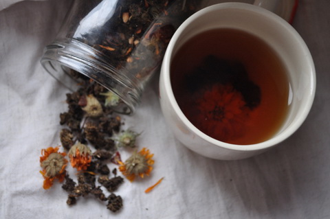 - сырье в количестве трех маленьких ложек закладывают в заварочный чайник;