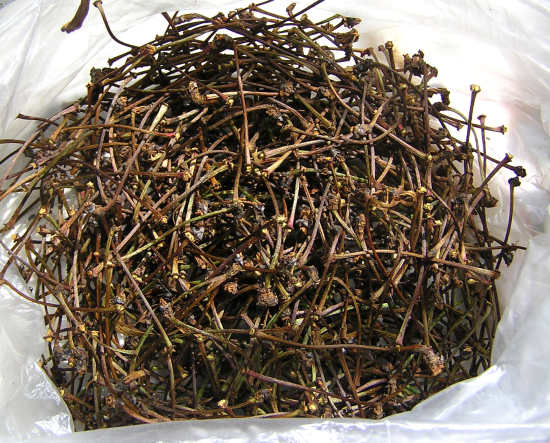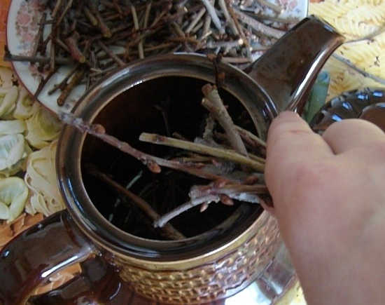 Веточки собирают в самом начале весны, когда только начинают набухать почки. Веточки берутся тоненькие в пределах 10 см, сушатся в хорошо проветриваемом помещении, связываются в пучки по 10-15 штук. Применять можно в течение года.