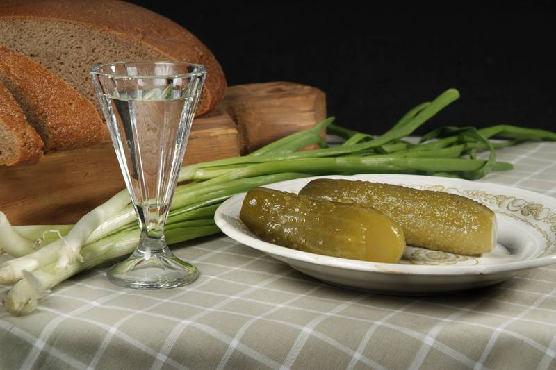 Хорошо закусывать водочку соленым огурчиком или квашеной капустой. Они хорошо снимают горький привкус, пополняют количество витамина «С» и натрия, разрушенных в результате приема спирта. Помимо пополнения запаса витаминов, квашеная капуста служит хорошим источником янтарной кислоты, что подстегивает метаболизм и выведение ядов, полученных в результате попадания в организм алкоголя.