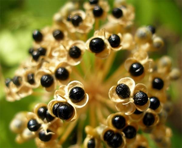 После отцветания из цветочных зонтиков образуются коробочки с семенами, за которыми надо внимательно следить, потому что созревают они очень неравномерно. Как только семена созрели, коробочки высыхают и раскрываются, чтобы семена могли высыпаться на землю. В этот момент их надо собрать и сразу же посеять на постоянное место