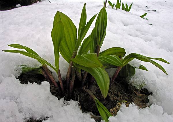 Первые побеги появляются весной при наступлении оттепели, пробиваются сквозь прошлогодние листочки.
