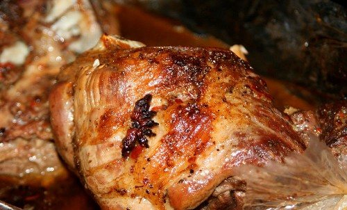 Запекать 50-60 минут или более при температуре 180-200 градусов. Желательно в процессе слегка поливать выделившимся соком.