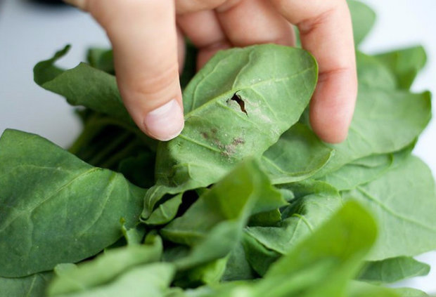 Свежие листья шпината будут хрустеть в пальцах. Сожмите два-три листочка. Должен раздаться отчетливый хруст. Это будет означать, что листья сорвали не более чем 12 часов назад. Гладкие, сочные листья без видимых повреждений, пятен и с тонкими стебельками — вот ваш правильный выбор.