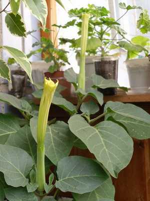 Для получения плода, траву удобряют 1 раз в 2 недели с мая по сентябрь. Цветет Дурман только летом. Пересаживать каждый год весной, в горшок большего размера, а побеги обрезать до половины.