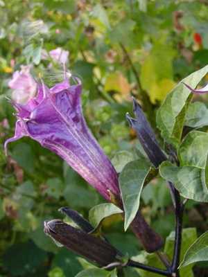 - Datura wrightii (дурман священный) имеет цветки фиолетового цвета с приятным сладким ароматом, до 20 см в диаметре. Распространено растение в северной Мексике и на юго-западе США.