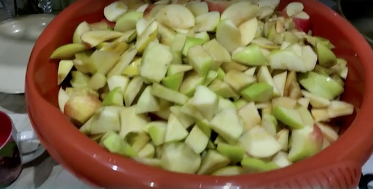 После этого фрукты очищаются от веточек и листьев, мелко нарезаются и перекладываются в заранее стерилизованную емкость с широкой горловиной. Сверху наливается получившийся сок. До краев заполнять емкость не нужно, поскольку должно оставаться место для образующейся пены и газа. Поверх яблок накладывается сахар.