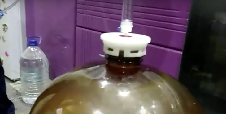 Бутыль закрыть специальной крышкой, в которую вставляется гидрозатвор для выхода газа. Это могут быть как самодельные варианты, так и магазинные. Если такого устройства нет, то гидрозатвор заменит обычная медицинская перчатка. Её одевают на горлышко бутыли, закрепляют с помощью тесёмки или скотча, чтобы предотвратить доступ воздуха и перчатка не слетела при брожении.