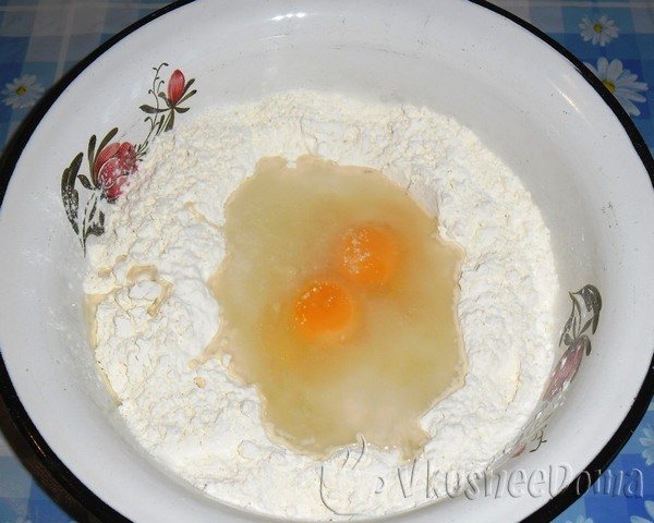 В миску насыпьте муку, разбейте туда два яйца, налейте холодную воду и положите соль .