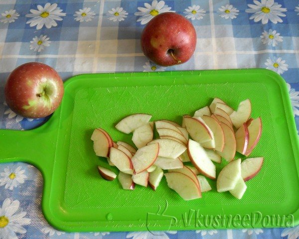А пока приготовьте начинку. Для этого яблоки разрежьте на четыре части, освободите от сердцевины и порежьте тоненькими ломтиками.