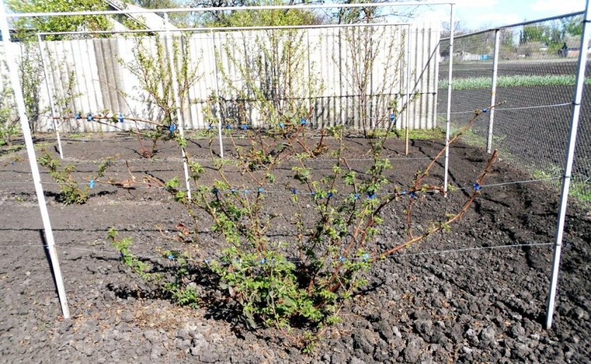 Для устойчивости кустов устанавливают шпалеру. Первый ряд проволоки натягивают на высоте 60 см от уровня почвы. Каждый следующий — через 30 см от предыдущей. Самый верхний ряд должен находиться на высоте 180 см над уровнем грунта. Опорные столбы обязательно углубляют в землю на глубину 60 см. Это обеспечит устойчивость конструкции при сильных порывах ветра.