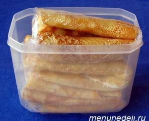 2. В данном рецепте я выбрала трубочки, так они компактнее занимают место в морозильной камере. Каждый блинчик отдельно оберните пищевой пленкой. Возьмите несколько штук блинов для одной порции, например, 4-6 шт. и пищевой пленкой оберните их вместе. Сверху на пленку приклейте этикетку, на которой напишите дату заморозки. Все блинные трубочки сложите в контейнер и отправьте в морозильную камеру. Храните их до полугода. По такому же принципу можно замораживать блины с любой начинкой.