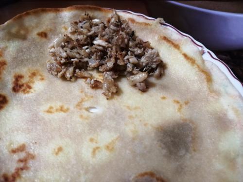 Начинку кладу где-то по столовой ложке на самый край блина, затем подворачиваю края с обеих сторон.