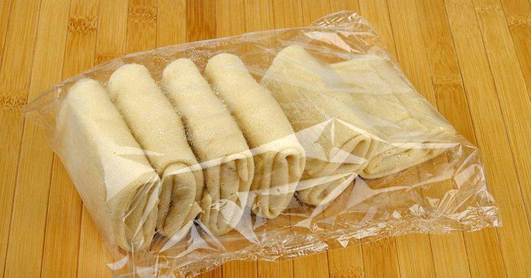 При замораживании блинов без начинки каждый блин нужно отделить от другого слоем пищевой пленки, а потом обернуть всю стопку пленкой и сверху наклеить стикер с указанием даты. Или просто обернуть всю стопку остывших блинчиков в пищевую пленку или положить в пакет и потом плотно его завязать. Такие блины после разморозки можно просто съесть со сметаной или вареньем, например, а можно завернуть в них что-либо уже потом.
