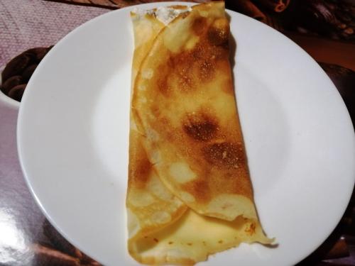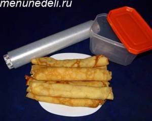 Блины лучше делать довольно плотными и толстыми, чтобы они выдержали качественное скручивание. Да и сытнее они получаются. Красота тут особой роли не играет, главное, чтобы они были без дырок, в которые может просыпаться или протечь начинка.