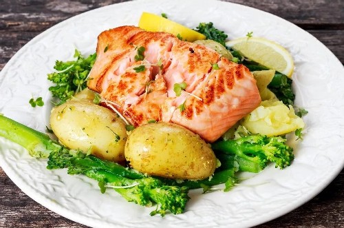Нежная горбуша, запеченная в духовке с картофелем, брокколи и зеленью –блюдо для каждого. Бокал белого вина будет дополнением к нему.