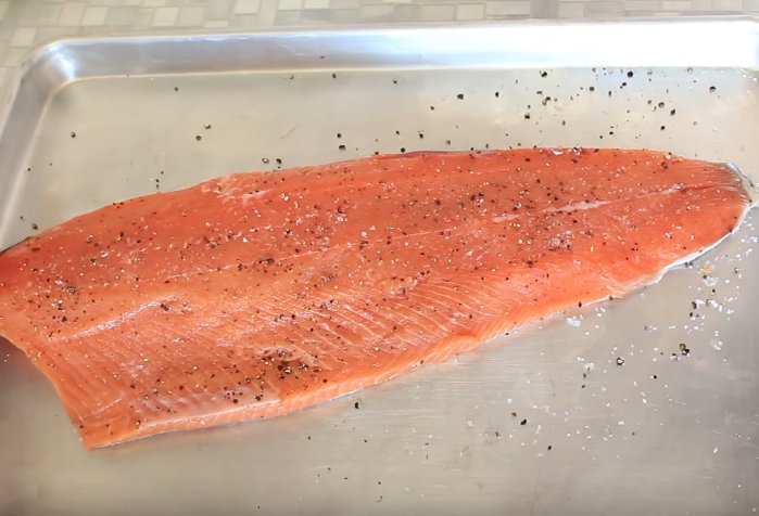1. С тушки горбуши счищаем чешую, срезаем плавники и потрошим. Промываем под струей воды и обсушиваем бумажными полотенцами. Натираем смесью перца и соли со всех сторон и внутри.