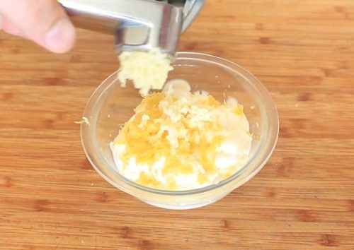 2. Сыр натираем и хорошенько перемешиваем со сметаной.