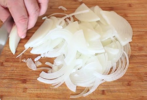 - Лук порезать полукольцами, картофель – дольками. Все смешать и немного подсолить.