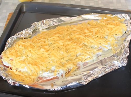 В завершении залейте рыбу с картофелем яично-сырной смесью. Не нужно закрывать рыбу фольгой сверху, иначе мясо получится вареным.
