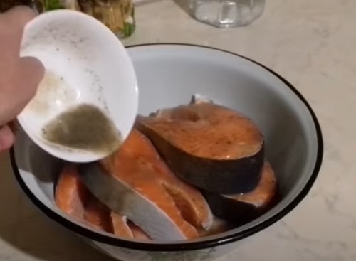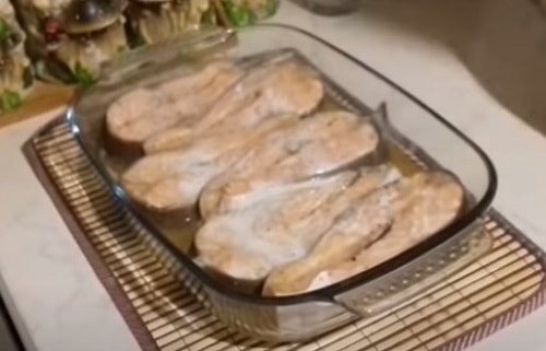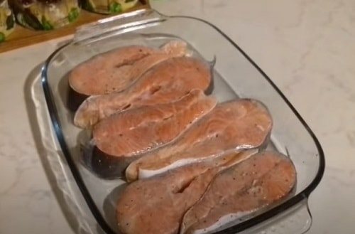 - Куски рыбы натираются солью и специями, а потом выкладываются в форму.