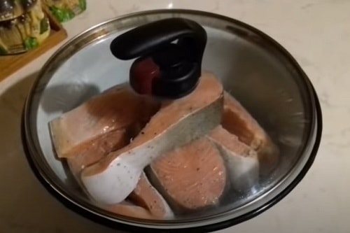 - Нужно разогреть ее на плите, затем обжарить стейки форели до готовности, по 3-4 мин. с каждой из сторон.