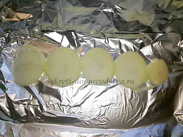 - Вначале на дно фольги уложить нарезанный кольцами лук.