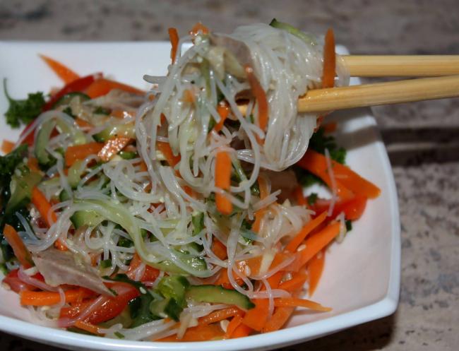 В азиатских странах весьма популярны самые разные салаты, в состав которых входит стеклянная лапша. Их рецептов невообразимо много. Эти блюда используются и как закуски, и как гарниры, а также вполне могут употребляться отдельно. Чаще всего основной продукт («макароны») в эти блюда идет быстрого приготовления: замочил – слил – готово. Но вы при готовке руководствуйтесь инструкцией на упаковке. Чтобы приготовить описываемый салат со стеклянной лапшой, четверть кило говядины режется удлиненными тонкими полосками и быстро, на очень горячей сковородке, обжаривается. К мясу вбрасываются полоски большого сладкого перца и колечки стебля порея. Через две минуты добавляется стеклянная лапша и измельченный чили. Несколько минут совместной готовки – и салат выкладывается в салатник. Для него готовится заправка: сок одного лимона смешивается с четырьмя ложками куриного бульона, двумя – арахисового масла, одной – сахара, солью и перетертым кориандром. Есть готовое блюдо положено в теплом виде. В качестве уточнения следует добавить, что лапши должно быть в три раза меньше, чем говядины.