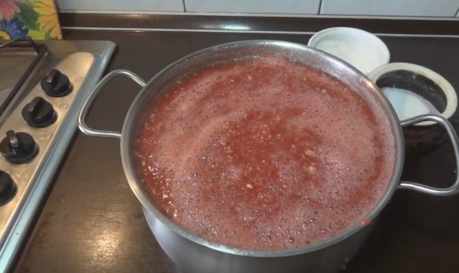 - Когда горлодер из помидор с чесноком без хрена уварится до половины объема, распределить по таре.