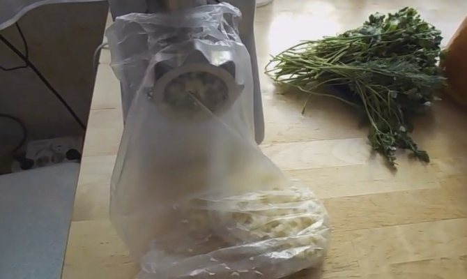 2. Хрен помойте и очистите, и прокрутите его на мясорубке, а чтобы глаза он не разъел оденьте на электроприбор пакет. Далее отодвиньте пакет с содержимым в сторону.