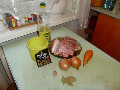 Телячьи ребрышки — 1 кг; Лук репчатый — 2 шт; Морковка — 1 шт; Чеснок — 1 зубчик; Лавровый лист — 3 — 4 листика; Перец черный молотый; Соль; Масло растительное;