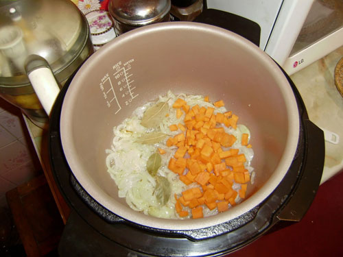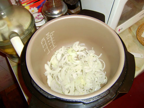 Лук очищаем и нарезаем полукольцами. Чеснок мелко сечем. Загружаем эти компоненты в варочную емкость мультиварки, добавляем 3 — 4 столовых ложки растительного масла и обжариваем до прозрачности лука.