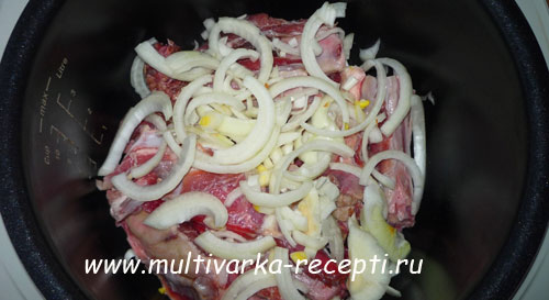 - К обжаренным ребрам в чашу мультиварки добавить картошку, морковь, лук. Налить воды так, чтобы закрыть содержимое чаши на две трети.